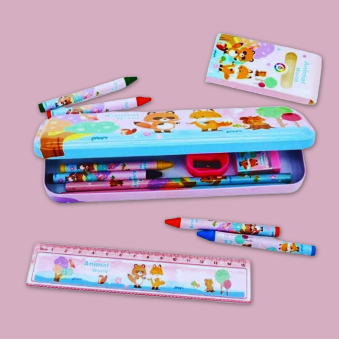 • πŸ“š All-in-One Kit: Complete 7-piece set with pencils, ruler, eraser, sharpener, pouch, and tin box – everything your child needs!